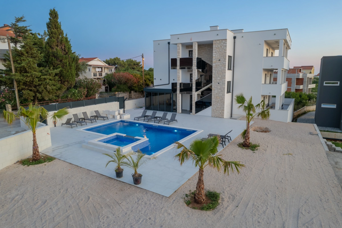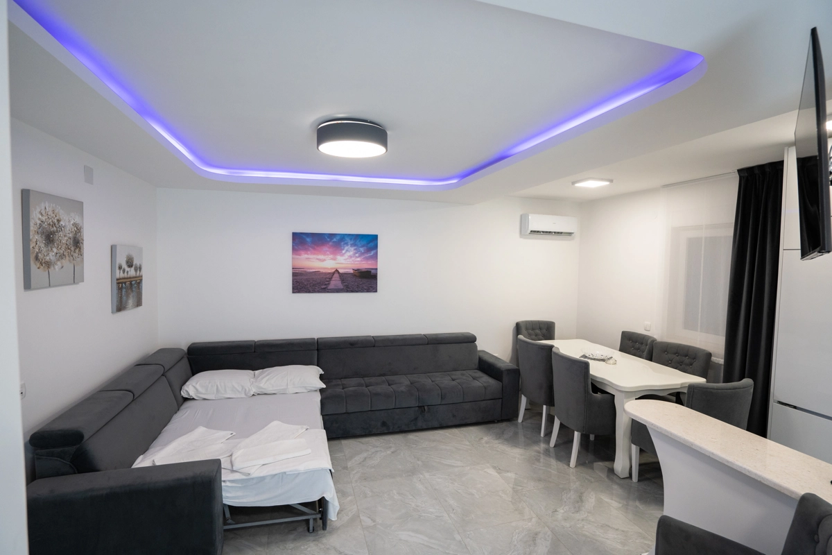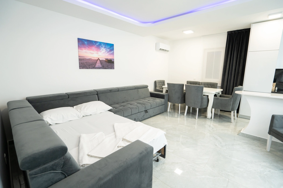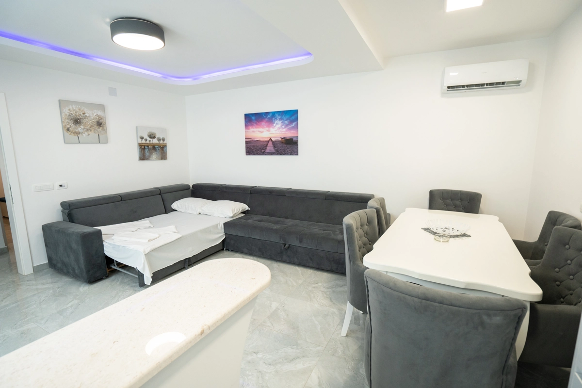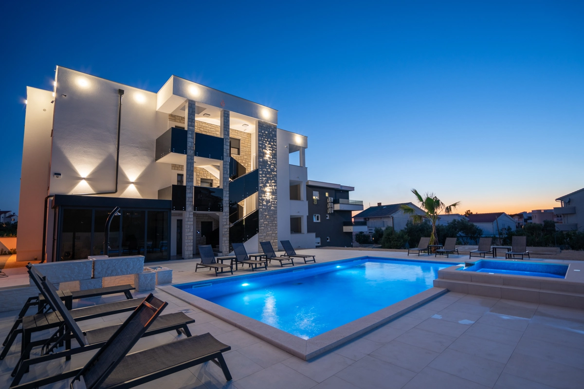 The Princess Apartments offer a luxurious, relaxing escape in Novalja, complete with a sparkling outdoor pool and spacious accommodations. This premium property has six large apartments, each designed to host up to 7 guests, making it perfect for families or groups of friends looking to enjoy a blend of comfort and style.
